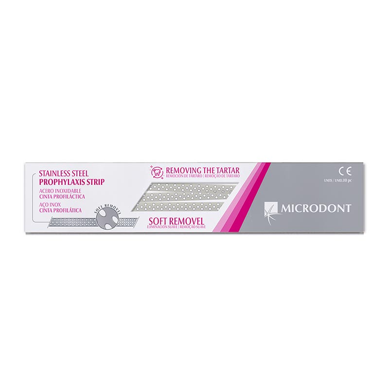 Cinta Profilática acessa com facilidade a região proximal, onde sua face ativa age eficazmente na remoção de cálculos dentais. As microlaminas circulares, localizadas em torno dos furos em uma das faces da fita, tem como principal característica uma poderosa ação contra os cálculos, preservando porém a integridade do esmalte e dos materiais restauradores.