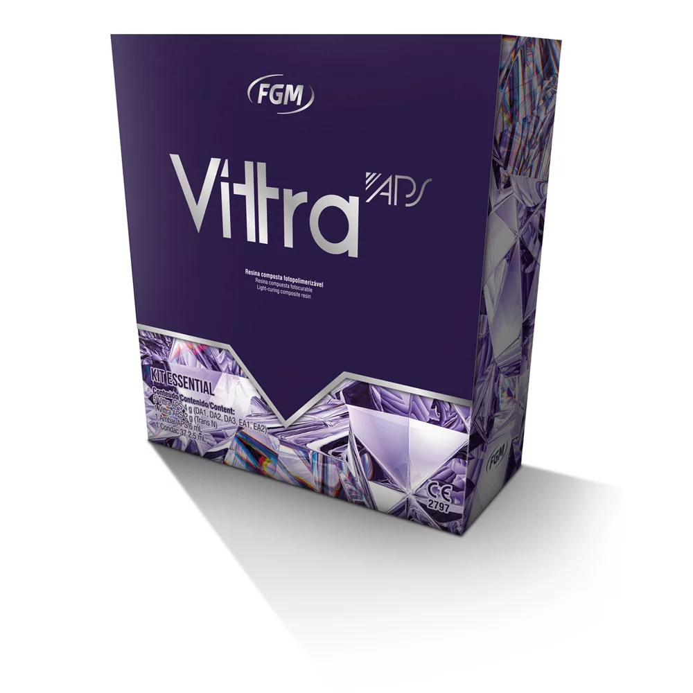 Vittra APS é uma resina composta submicrométrica de alta estética indicada para restaurações de todas as classes em dentes anteriores e posteriores. O compósito é rádiopaco e apresenta carga de silicato de zircônia esferoidal, com esferas de um complexo de zircônia, com tamanho médio das partículas fundamentais de 200nm, conteúdo total de carga inorgânica em peso de 72% a 82% (52% a 60% em volume, características estas, que contribuem para elevadas propriedades mecânicas e altas estética, especialmente evidenciadas pela facilidade em se obter polimento e longevidade de brilho. A formulação de Vittra APS é livre de Bis-GMA e Bis-EMA, seguindo tendência atual de produtos livres da possiblidade de conter Bisfenol A (BPA). O sistema de fotopolimerização APS (Advanced Polymerization System), presente na resina, permite obter polimerização sem alteração de cor perceptível (mesma cor antes e após a fotopolimerização) e maior tempo de trabalho sob luz ambiente.